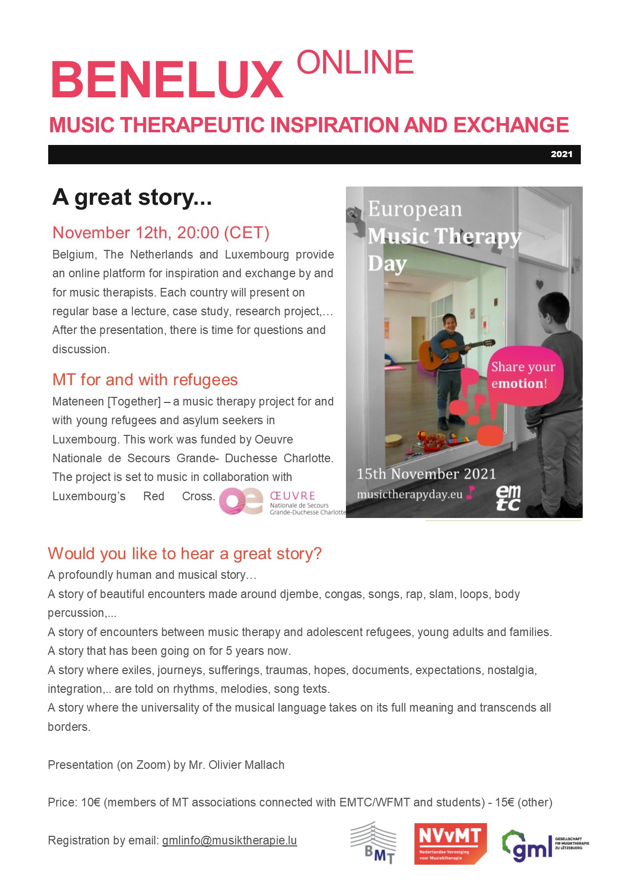 Zum Europäischen Tag der Musiktherapie veranstalten die musiktherapeutischen Verbände der Beneluxstaaten ein Online-event. Am 12.November wird es einen Vortrag (auf Englisch) geben. Es wird ein luxemburgisches Musiktherapie-projekt vorgestellt. Hierin geht es um die Arbeit mit Flüchtlingen.